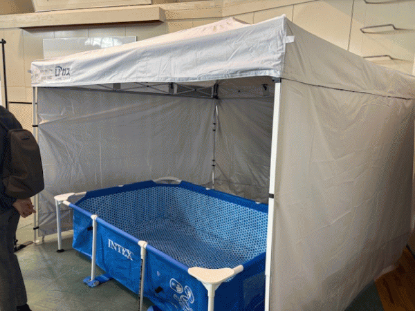 組み立て式のフレームプール(アイスバス)は、現場で消防の防火服のまま