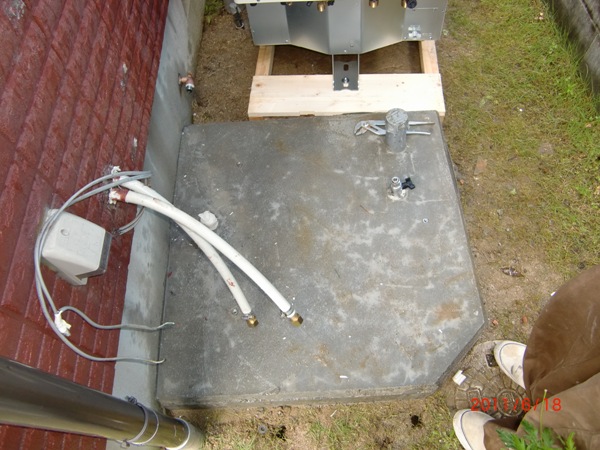 基礎が固まれば、いよいよエコキュート本体の設置です。