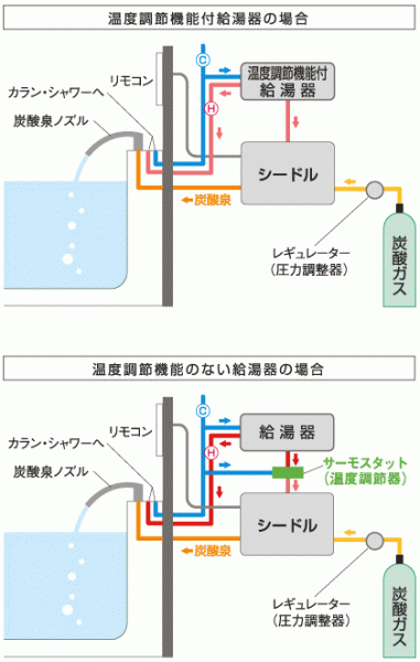 シードルは、給湯器からのお湯とボンベからの炭酸ガスを瞬時に炭酸泉にして専用の炭酸泉ノズルから浴槽に給湯します(ワンパス方式)。ご家庭では、 温度調節機能の付いていない給湯器をご使用のケースもありますが、この場合には温度調節器を取付けることでシードルがご利用いただけます。